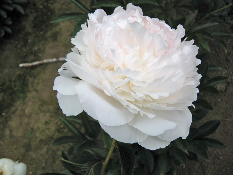 Blanca doble, inicialmente de color crema, forma de rosa, algunos pétalos con contornos rojos. Tallo vigoroso de color verde, 70 cm de altura, botón de 3,7 cm. Florece como de media estación, con un aroma muy suave.
