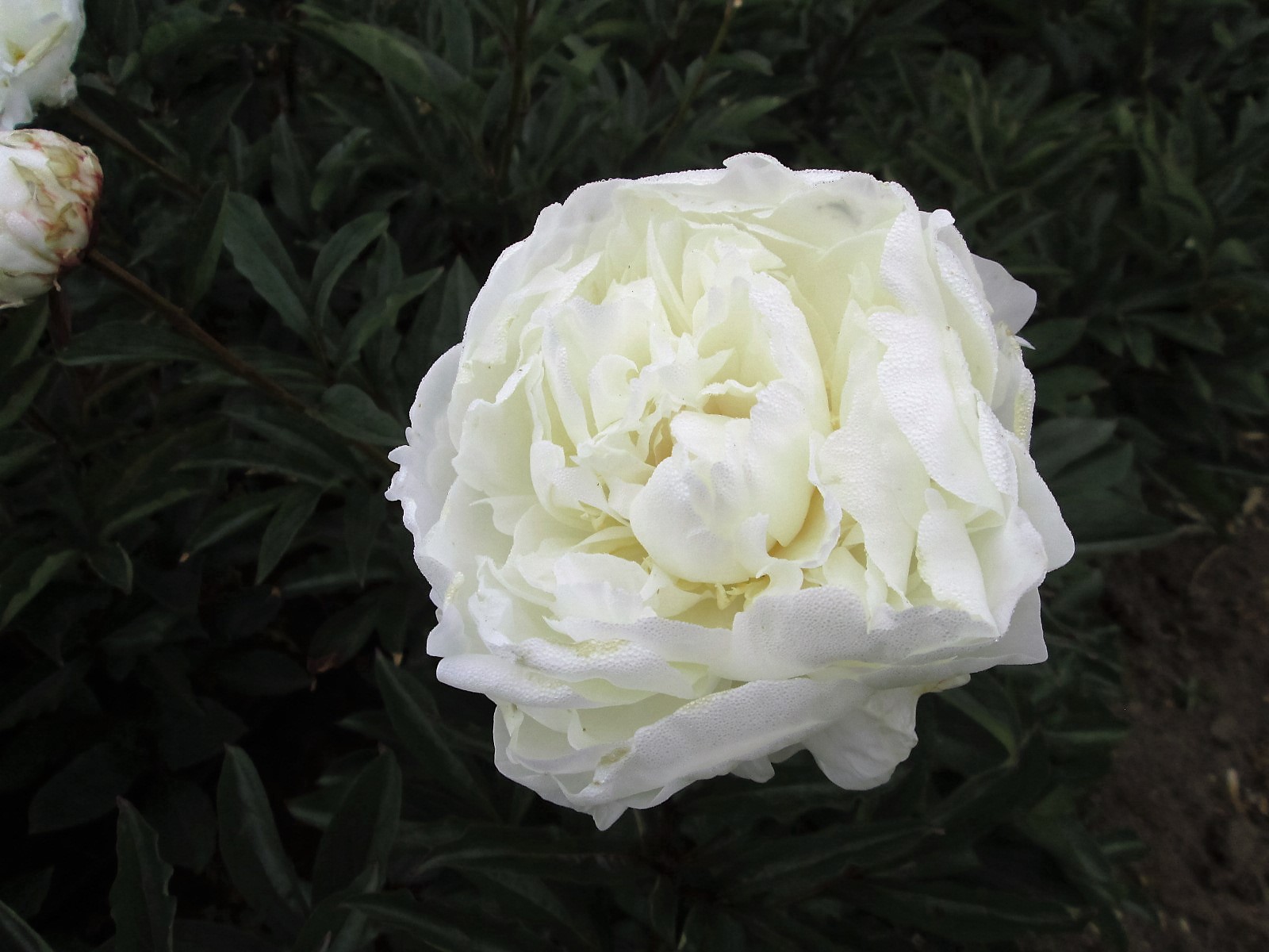 Blanca, doble, flor grande de forma de rosa, en un tallo vigoroso de color café rojizo, de 75 cm. de altura, y una botón de 3,5 cm. Algunos pétalos presentan un contorno rojizo, Se comporta como tardía, con aroma muy suave.